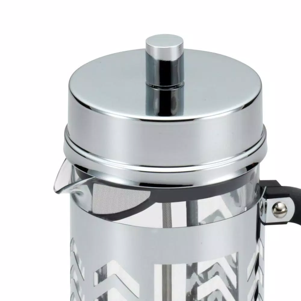 Sip and savor fresh, flavorful coffee and espresso beverages created with the BonJour Coffee 8 Cup Chevron French Press. Crafted from heat-resistant borosilicate glass, the carafe is encased in a sturdy, beautifully-designed stainless steel frame with striking chevron cutout patterns. The stylish press brews 33.8 ounces of coffee β eight 4-ounce espresso-sized cups. Featuring a comfortable handle, easy-pour spout and gleaming stainless steel lid, the French coffee press makes an elegant service choice in the kitchen, at the table, or wherever itβs enjoyable to unwind while savoring authentic coffee flavors. The patented BonJour(r) Flavor Lock(tm) stainless steel filter system allows the brewing process to be stopped in the coffee press when the desired strength is reached, and a filtering lid helps reduce sediment in cups of espresso and gourmet coffee beverages like cappuccinos, mochas and lattes. Handwashing the glass French press is recommended to preserve its finish. And this eye-catching French press makes an ideal partner for BonJour(r) milk frothers and other coffee items. Easily create authentic, flavorful gourmet coffee drinks using the uniquely-styled BonJour Coffee 8 Cup Chevron French Press.