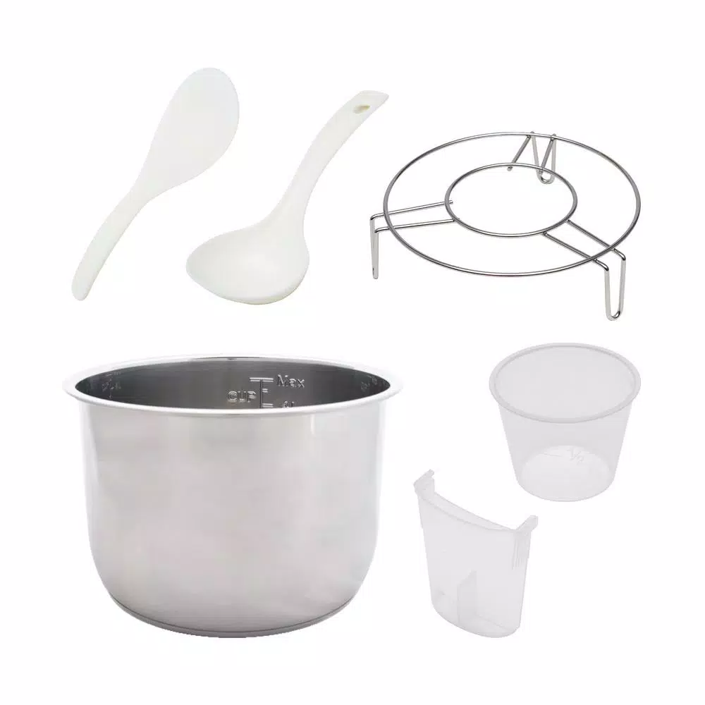 - Includes the following accessories to make food preparation even more convenient: Stainless steel rack, soup ladle, rice scoop, measuring cup and a condensation collector