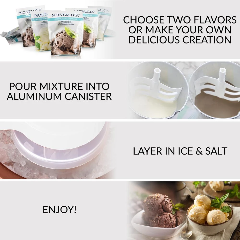 - Nostalgia ice cream kits: unit works perfectly with all nostalgia ice cream mixes – try vanilla creme (ICP825VAN), chocolate (ICP825CHOC), strawberry (ICP825STRAW), and no sugar added vanilla (ICP825VANSF)