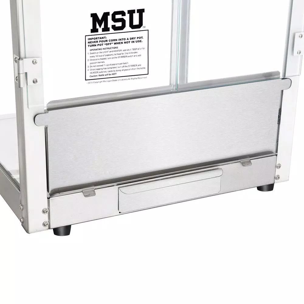 Michigan State Spartans fan know that the world is made up of only two colors; Green and White. Great Northern Popcorn Company is proud to offer its finest popcorn machine 100% licensed by Michigan State to carry the logo and branding of MSU. Sparty on. These commercial quality machines feature stainless steel food-zones, easy cleaning stainless steel kettles, heated warming decks, old-maid drawers (for un-popped kernels), tempered glass side and back panels and an industry leading 8 oz. kettle operating on 860-Watt. Our machine was designed with small perforations in the bottom stainless tray to allow the un-popped kernels to fall into the drawer. Simply rake the popped corn with a scoop and the old-maids disappear. Additional Features: Works on standard 110-Volt. Top Machine is 25 in. H x 21 in. L x 18 in. D Weighs roughly 45 lbs. 8 oz. Kettle Warming Deck to keep the popcorn warm and fresh. 3 Switch Design.