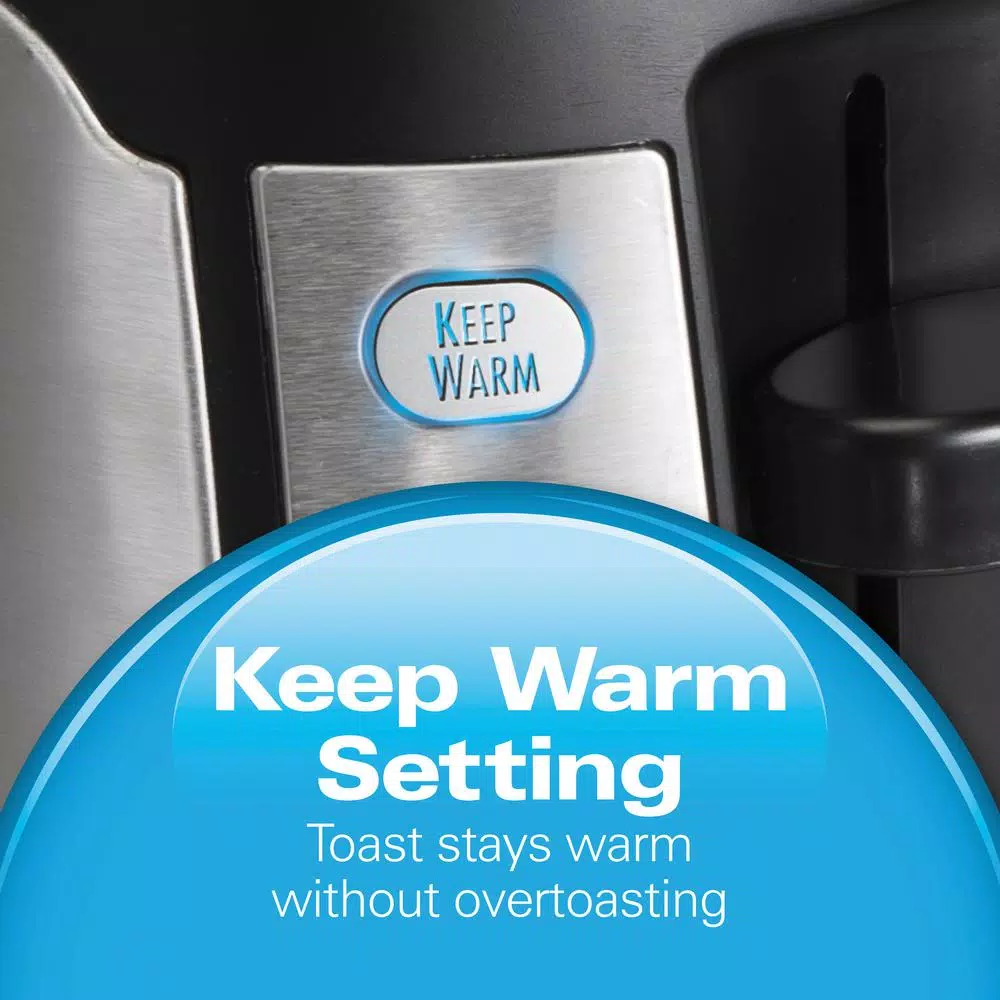 Keep your toast hot and fresh with Hamilton Beach Keep Warm 4-Slice Long Slot Toaster. Your breakfast or snack can stay warm for an extra 3-minutes without over-toasting thanks to the Keep Warm setting, making it great for multi-tasking mornings. Plus, with extra-long, extra-wide slots, its ideal for toasting bagels and your favorite thick-sliced bread. The toaster comes equipped with settings for Bagels and Defrost, so you get the perfect toast every time. Use the Bagel setting to toast only the cut side and Defrost for thawing or toasting frozen breads. The cool-wall feature keeps the toaster cool to the touch, while toast boost makes it easy to remove foods. Perfect for busy days when the last thing you want to do is battle your toaster. This stylish stainless steel toaster comes with illuminated buttons for easy view and a cord wrap on the bottom for clutter-free storage.